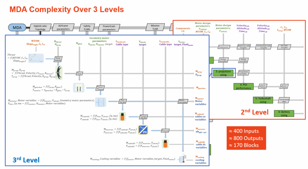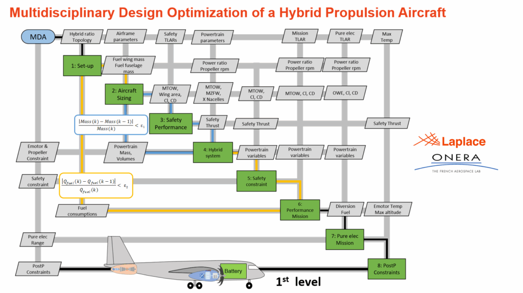 Multidisciplinary and multilevel optimization approaches (“Multidisciplinary Design Optimization”): these aim to organize the design process into several hierarchical levels, ensuring the integration of couplings between components and disciplines in complex systems. Current work on this topic, applied to ‘more electric’ aircraft, in collaboration with ONERA and IRT Saint-Exupéry, is leading to higher levels of complexity due to the number of disciplines involved (aerodynamics, aircraft structure, electric and thermal propulsion, cooling systems, electromagnetic compatibility…) and the number of parameters considered (up to a hundred decision variables and thousands of constraints).