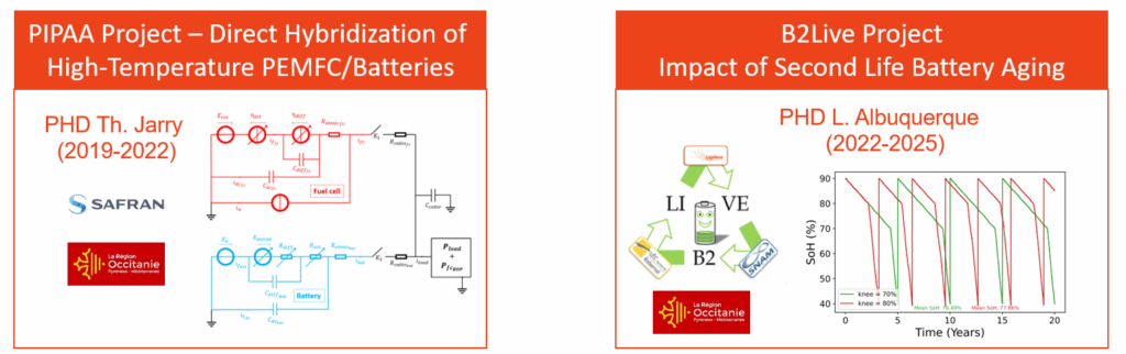 To implement battery storage into systems, our research focuses on battery modeling with the estimation of their state of health. The implementation of these battery models is based on characterization and aging campaigns carried out on the battery bench. Recent work (Lucas ALBUQUERQUE’s thesis – B2LIVE project https://ut3-toulouseinp.hal.science/hal-04505925v1), has made it possible to develop a model of second-life battery packs for the co-design of a microgrid. In the embedded field, the impact of direct fuel cell/battery coupling on the optimal sizing of the system has been studied (Thomas JARRY’s thesis – PIPAA project).