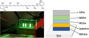 2) OLED avec ß-carotème comme bloqueur des trous – il contient 40% de matériaux bio-sourcés.
